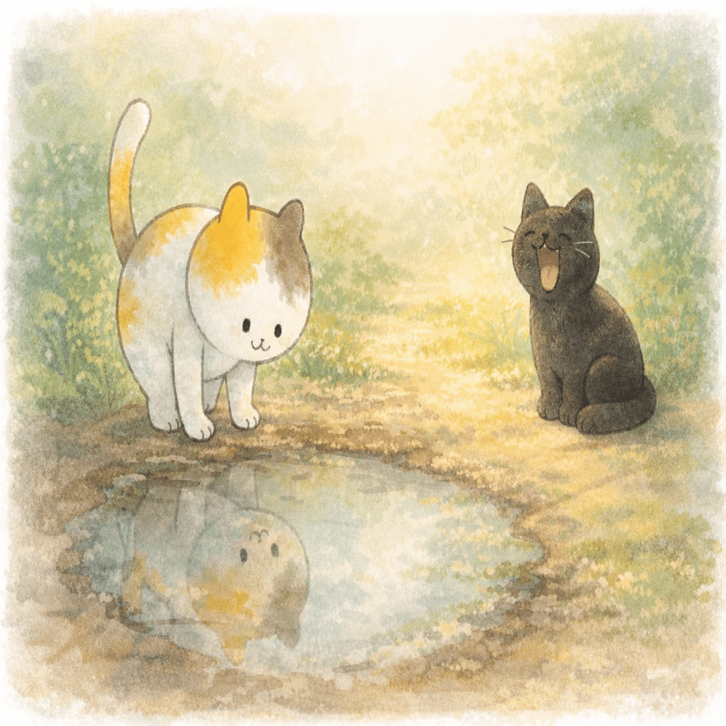 「水たまりは、ただ光が跳ね返っているだけだにゃ。