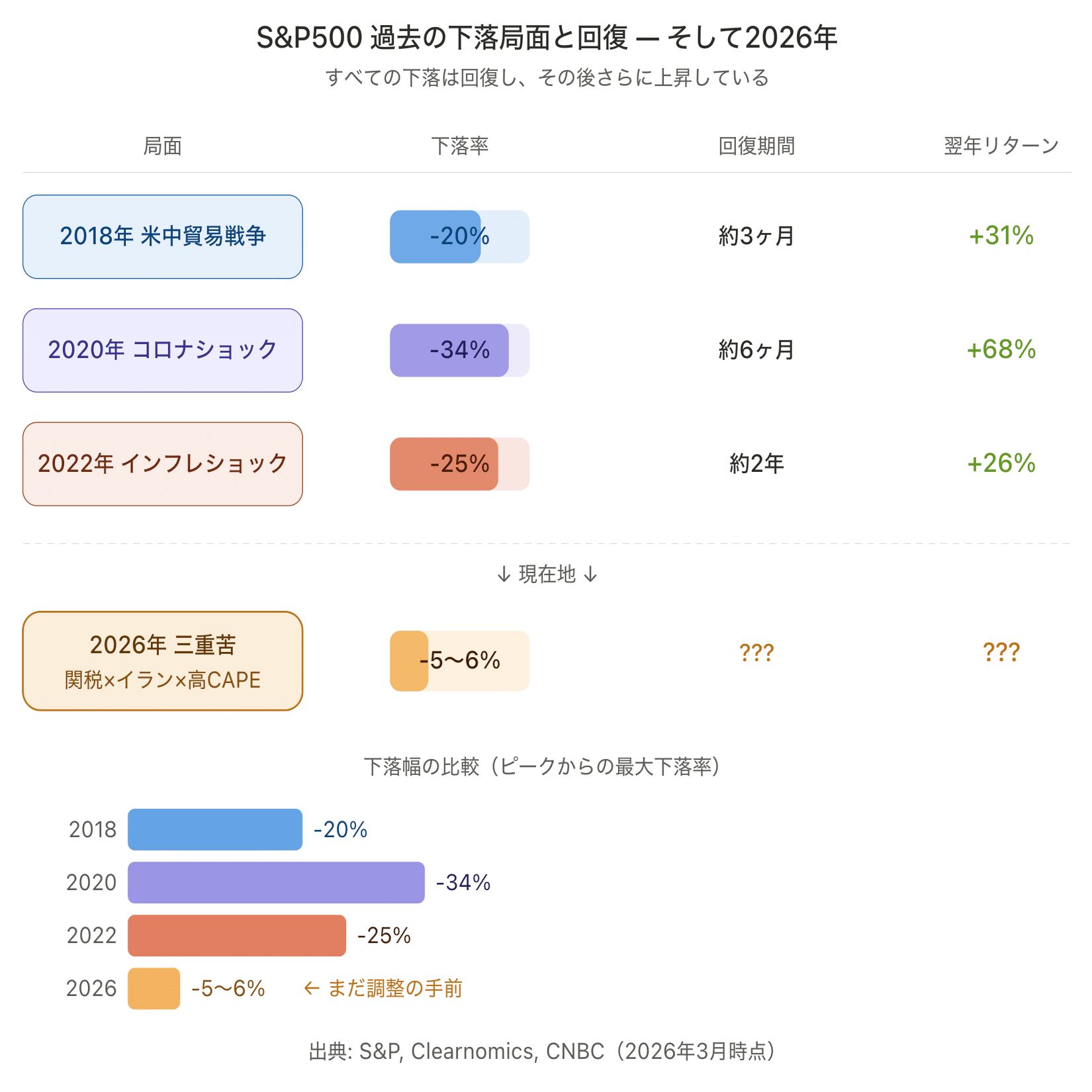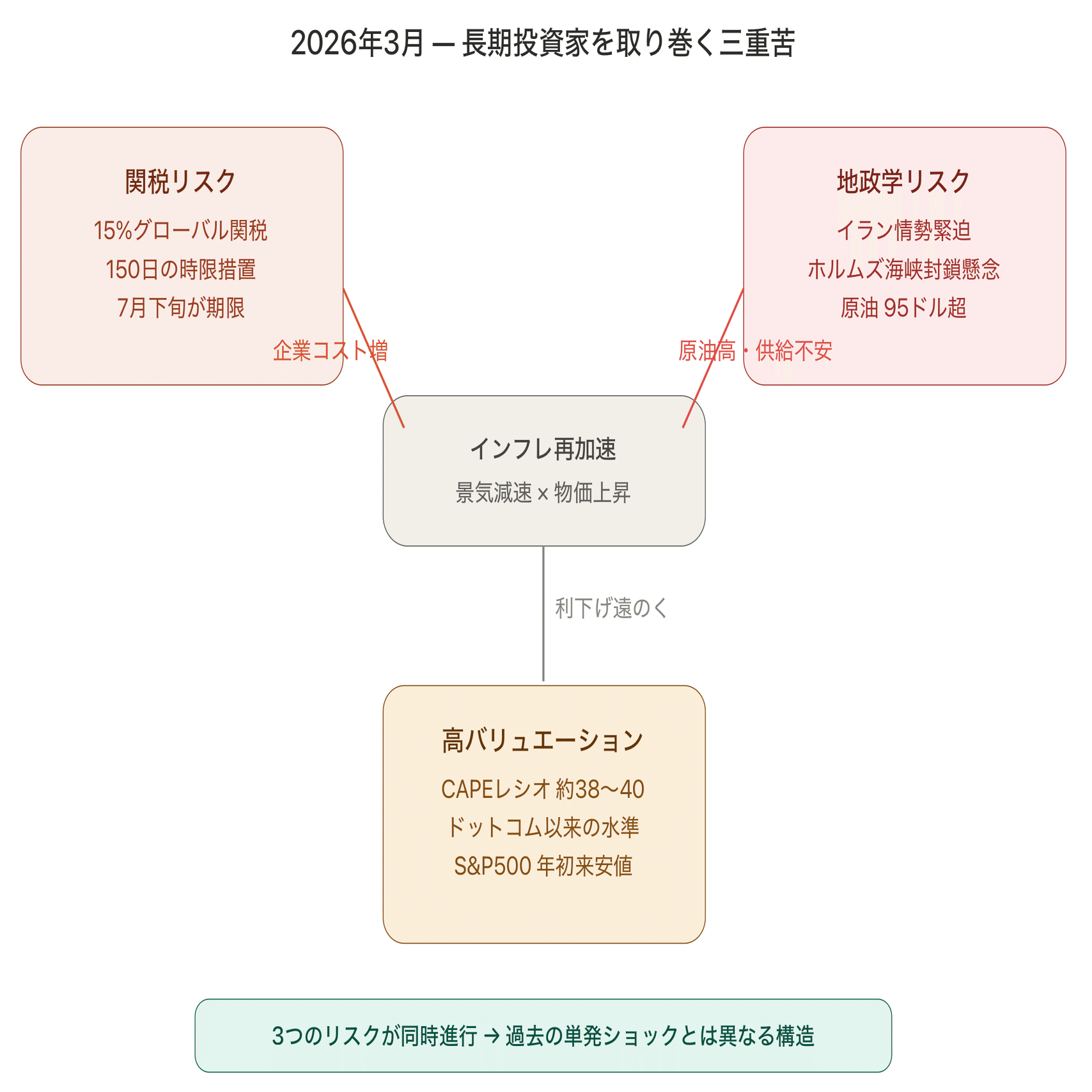 2026年3月は「関税 × イラン情勢 × 高バリュエーション」の三重苦が同時進行する、過去の単発ショックとは異なる局面です。